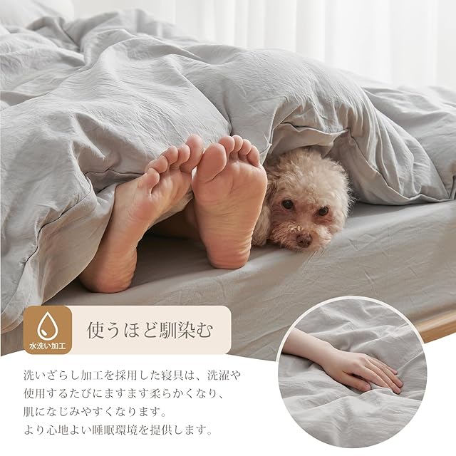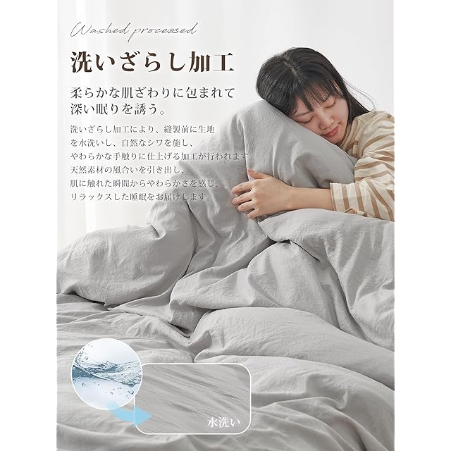<洗いざらし&超柔らか肌触り>: 洗いざらしとは何度も洗って風合いが自然になったもの。お使いいただく初めから自然な風合いや、やわらかな肌触りを楽しめるように「洗い加工」を施しています。この加工を施した寝具は、洗濯や使用するごとにさらに柔らかくなり、肌馴染みも良くなります。