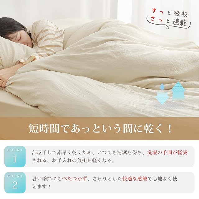 <通気性と速乾性>: 素材:ポリエステル100%。通気性が高いため、寝具の中で湿気がこもりにくく、快適な寝心地を提供してくれます。この布団カバーセットは速乾性も優れています。洗濯後に素早く乾くため、洗濯の手間を軽減できますし、清潔さを保ちやすくなります。