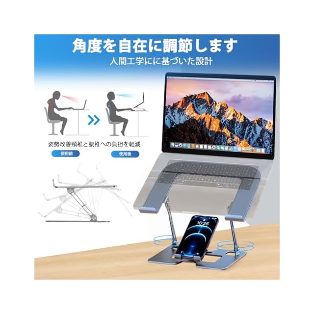 商品名:SuperKois ノートパソコンスタンド スマホスタンド付 パソコンスタンド 折りたたみ式 pcスタンド 無段階高さ&角度調整可能 タブレット スタンド 滑り止め アルミ製軽量 安定 高耐荷重 放熱対策 省スペース 人間工学設計 姿勢改善 腰痛&猫背&肩こり解消