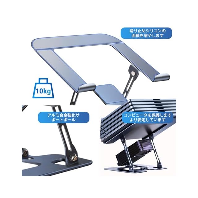 【アルミ製で軽量&安定性優越】当社のノートホルダーはアルミ合金製です、軽量さを保ちながら最大 10kg まで耐えられます、安定性が抜群です、最大17インチのノートパソコンに対応しています。逆に、調節に力が必要な分しっかりしているので、使用中に下がってくるようなことは無い、頑丈で安定しています。