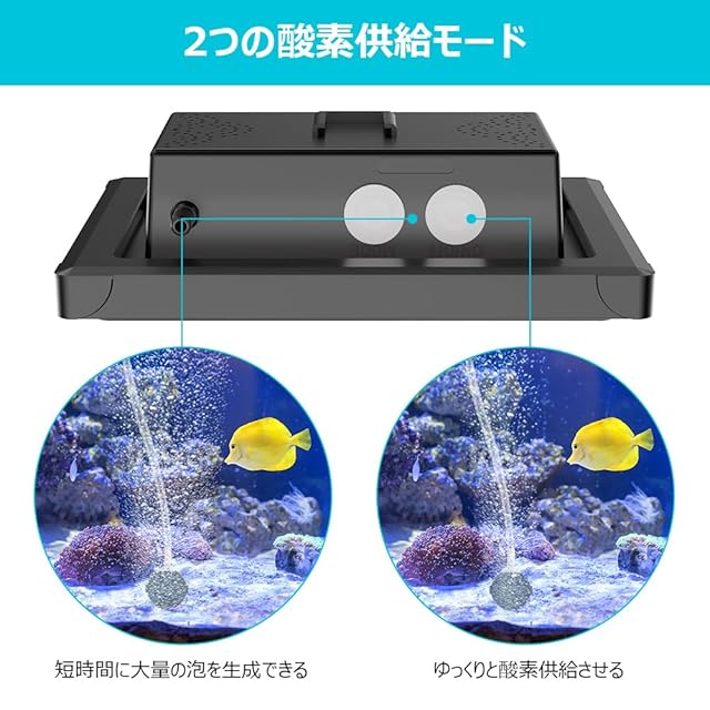 [三つ作業モード]エアーポンプは強力モード、微力モードと間隔微力モード三つ作業モードあり、強モードであれば短時間に大量の空気泡を発生させ、間隔モードであれば10秒程度のインターバルで空気泡を発生させます。