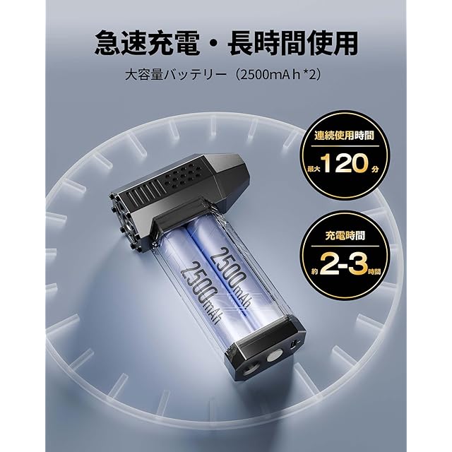 【5000mAh大容量バッテリー・安全安心】従来2000mAh容量電池と比べて、KOJIHOMU電動エアダスターはバッテリー容量2倍以上!フル充電しなら、最大約120分で使用できます。また、加熱保護のために、中風と強風モードで10分後に電源を自動的にきれます。