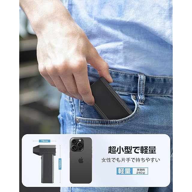 【スマホサイズのエアダスター・驚きの小ささ】小型ブロワーのサイズは129×78×37mm、重さは240g(本体)で、手のひらサイズで片手でも持ちやすい設計です。それでいて、超強力な噴射力でホコリを楽々吹き飛ばせる電動エアダスターです。見た目だけでなく、操作性にもこだわり、妥協のない使い心地を追求しました。小型で軽量ながらパワフルな性能を持ち、ホコリがたまりやすい場所の掃除に大活躍します。