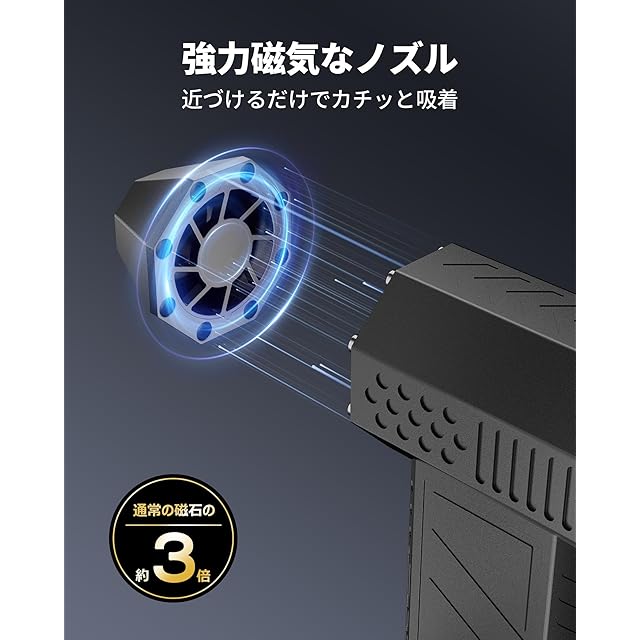 【マグネットで簡単に吸着】通常の磁石の3倍の強力なマグネットを内蔵したノズルは、近づけるだけでカチッと簡単に吸着します。面倒な位置合わせや回転作業も不要で、取り付けや取り外しがスムーズに行えます。さらに、取り付け時や取り外し時に耳障りな音が鳴ることはありません。磁吸部品は摩耗や劣化が少なく、長期間にわたり高い性能を維持します。