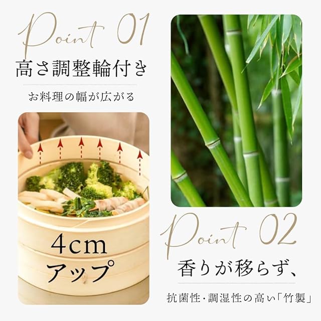 ✅【香りが移らず、抗菌性・調湿製の高い竹製】木の香りが食材に移らないので、食材そのものの味や香りを損ないません。また竹は耐久性が高い上に抗菌性や調湿製にも優れていて、ホクホクの程よい蒸し上がりになります。