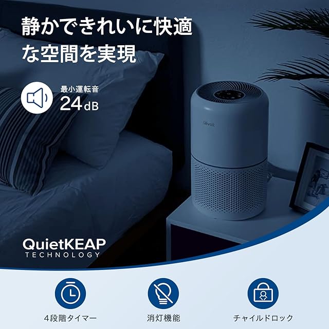 【静かで省エネ、つけっぱなしでも大丈夫! 】①特許取得済みのサイレントテクノロジーと特殊の風道設計で運転音を24dBに低減し、同時に、画面表示オフ機能も搭載されているので、光に敏感な方でもぐっすり眠れます。②静音の上におやすみモードの消費電力は14wですので、つけっぱなしにしても気になりません。