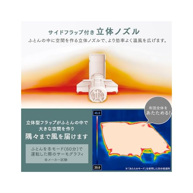【左右サイドフラップ】立体ノズルにサイドフラップが付くことで安定感UP♪立体型フラップが布団の中で大きな空間を作り、隅々まで風を届けます。【保温モード】自動モード運転中に保温ボタンを押し、運転終了後最大2時間の間、あたためと停止を繰り返し、お休みに適した温度を保つことができます。※夏・ダニモードでは保温設定できません。【便利な靴乾燥】付属のアタッチメントを取り付けることで、2足を一気に乾燥できます。スニーカーやブーツ、革靴にも対応!※本革や合皮、ビニール製など耐熱温度の低い素材の場合、「送風モード」を使用ください。