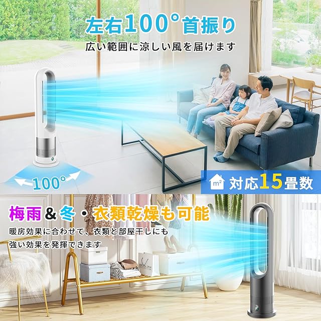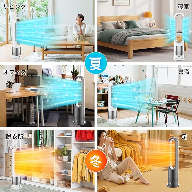 タワーファン 扇風機羽なし扇風機 冷暖両用 リビング扇風機 サーキュレーター DCモーター 静音運転 8段送風&3段温風 大風量 100°左右首振り 9時間切タイマー 省エネ 節電対策 お手入れ簡単 省スペース 組み立て不要 安全機能搭載 リモコン付 部屋 リビング 会議室 室内など対応 PSE認証済 日本語説明書