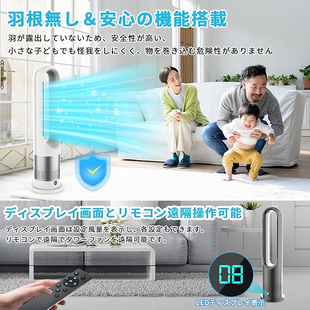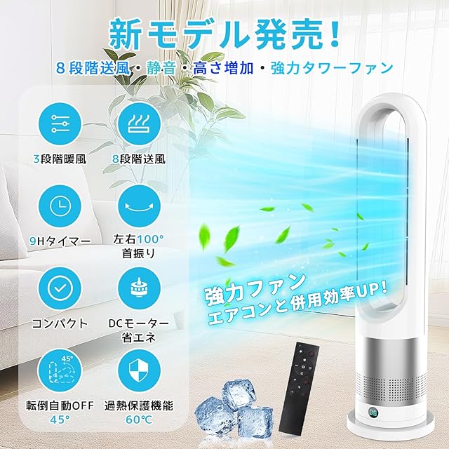 商品名:【2025新登場&冷暖兼用&DC電気節約】タワーファン 羽なし扇風機 冷暖両用 リビング扇風機 サーキュレーター DCモーター 静音運転 8段送風&3段温風 大風量 100°左右首振り 9時間切タイマー 省エネ 節電対策 お手入れ簡単 省スペース 組み立て不要 安全機能搭載 リモコン付 部屋 リビング 会議室 室内など対応 PSE認証済 日本語説明書
