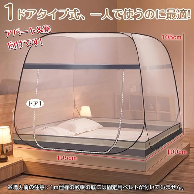 【素材&商品仕様&迅速な対応】本体素材:ポリエステル、ワイヤー:スチール。※100*195*105 cm仕様の蚊帳は1ドアタイプ式、その他は2ドアタイプ式。サイズは商品展開後に測定し、誤差は1-3cmで正常な現象であります。パッケージ内容: 蚊帳本体×1、スチールリング×1、収納袋×1 日本語説明書×1。meososから購入した商品で、商品が届いた後、初期に不具合があった場合や使用後6ヶ月以内に、商品ページの「販売元」→「質問する」。メール送信後は24時間以内に返信します!そして、お客様に他社より優れたアフターサービスを提供します。