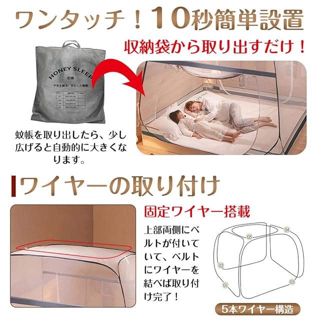 【10秒簡単設置&洗濯可能】ワンタッチで展開される蚊帳なので、初心者でも素早く取り付けることができ、蚊帳が開くと自動的に展開され、あとは上部の固定ワイヤーを取り付けるだけで完成です。慣れてくるとより早く設置を完了することができます。底部には固定ベルトも付属しており、ベッドで使用する際にも蚊帳を固定することができ、ズレが生じない。蚊帳本体は洗濯できる材質なので、そのまま洗濯すればいい。