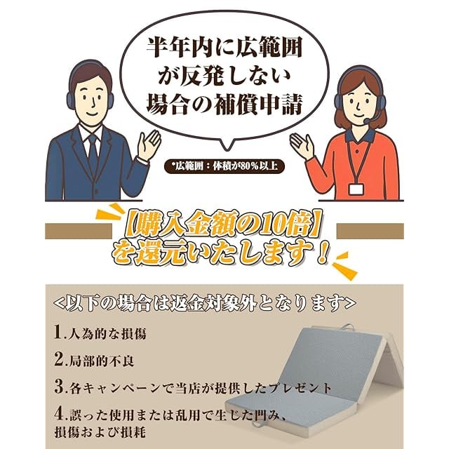 【半年後、マットレスがへたってしまったら…?】→ 当社なら10倍返金で完全サポート!三つ折りマットレスは、半年以内に体積が80%以上回復しない場合、他社マットレスと違い、✅当社は『10倍返金』で本物の耐久性を証明!*人為的な外力による损傷は対象外となります。⏳ 【数量限定】「10倍」適用キャンペーン中!今なら全サイズ対象!