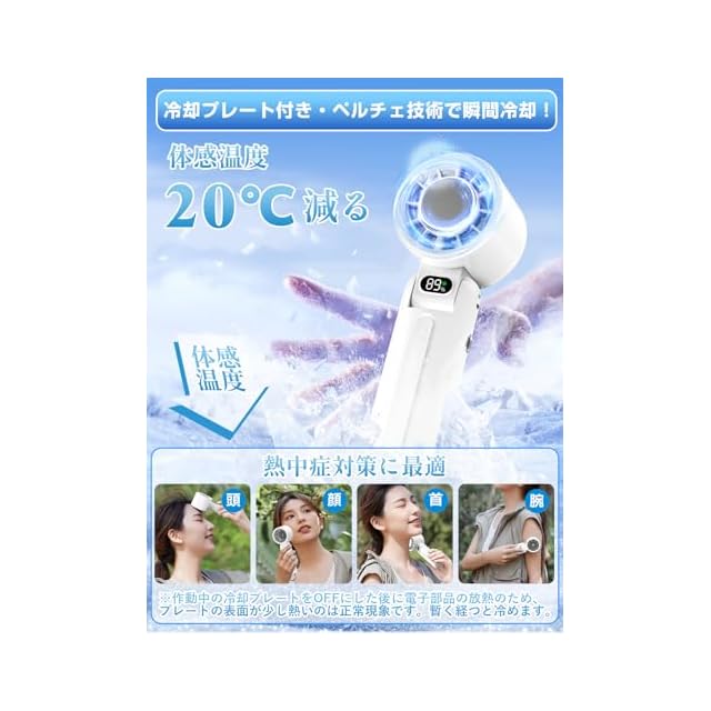 【冷感プレートで冷やす!熱中症対策に最適!】本携帯扇風機に冷却プレートが搭載されていて、炎天下で火照った肌に当てて瞬間に冷却できます。熱中症対策に最適です。製品本体の横の冷感ボタンを長押しすれば冷却プレートがONになります。冷感不要の時はまた長押すればOFFになります。※冷却プレートをOFFにした後に電子部品の放熱のため、プレートの表面が少し熱いのは正常現象です。暫く経つと、もしくはまた冷感をONにしたら熱が消えます。