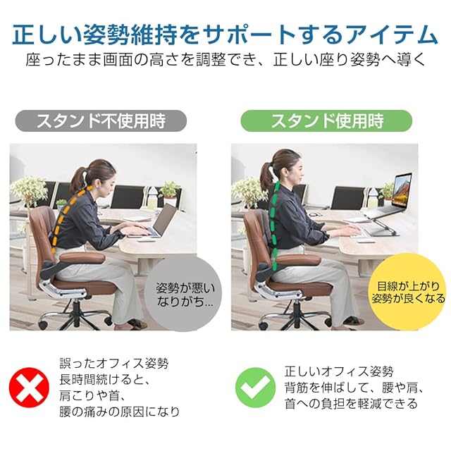 【無段階角度・高さ調整可能】人間工学に基づいて設計されたスタンドにより、PC作業時、PC作業時に高さと角度を無段階調整可能です。ノートパソコンスタンドを使うことでパソコンを目線と同じ高さにでき、背筋が伸びて自然な座り姿勢を維持しやすくなります。長い間のデスクワークによる首と肩への負担を軽減でき、猫背や腰痛の防止に有効です。作業効率の向上も期待できます。
