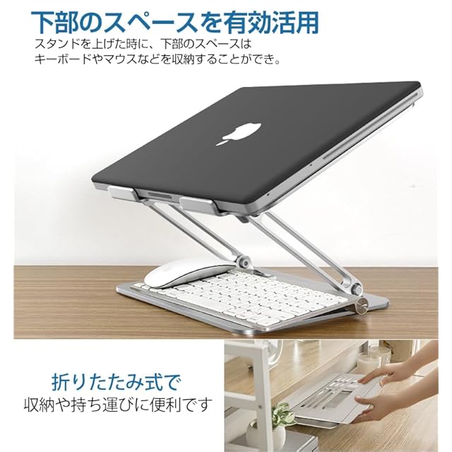 【持ち運び&収納便利】PCスタンドは折りたたみ式なので、占めるスペースが小さく収納しやすいです。二箇所の回転軸を折と、外出や出張等々に持ち運んで使用することができます。Z字型の構造で、パソコンスタンドの下に空間ができるので、スタンドの底部にキーボードなどが収納でき、省スペースを有効に活用されます。