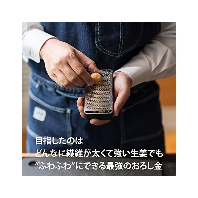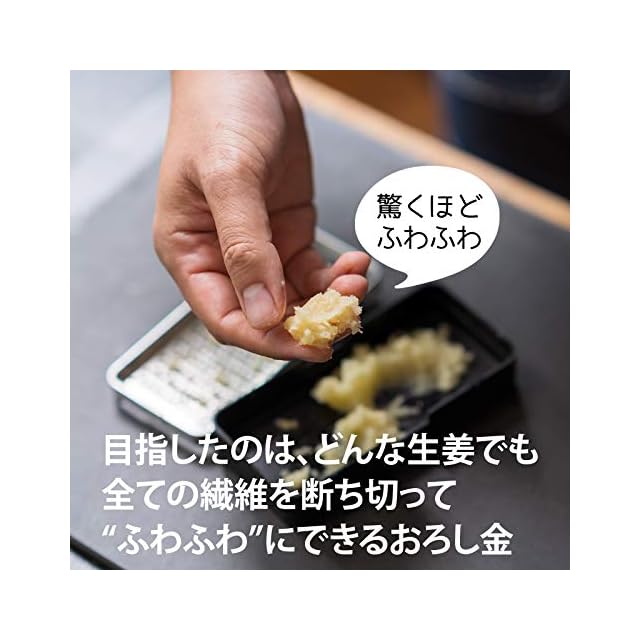 【おろし金には珍しい替刃式】「プロが唸った殿堂入り100名品」の一つとして選ばれました。飯田屋は、世界中で300種類以上のおろし金を徹底的に試し、比較検討を重ねた結果、たどり着いた「究極の"ふわふわ"おろし金」を誕生させました。刃が鋭いので、柔らかい食材は「撫でるだけ」で「ふわふわ」とした食感を引き出すことができます。さらに便利な受け皿も付属しており、料理中の飛び散りを防ぎます。