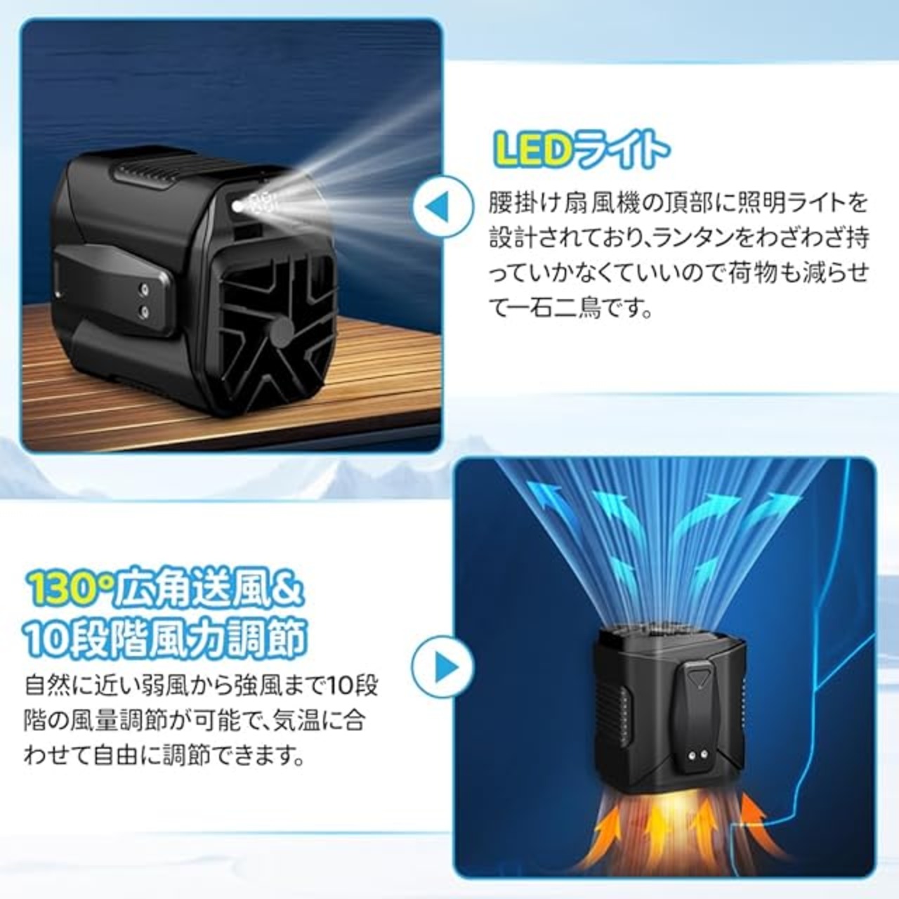 商品名:腰掛け扇風機【2025昇級版&1台5役】UPF 携帯扇風機 10000mAh大容量 ベルトファン 10段階風量調節 扇風機 小型 ウエストファン 強力 多機能 腰掛け/首掛け/卓上/手持ち 充電式 Type-C急速充電 LEDディスプレイ 残量表示 腰ベルト 静音 軽量 長時間稼働 屋外作業 持ち運びに便利 熱中症対策 暑さ対策 花火大会/スポーツ観戦/オフィス/アウトドアなどに適用