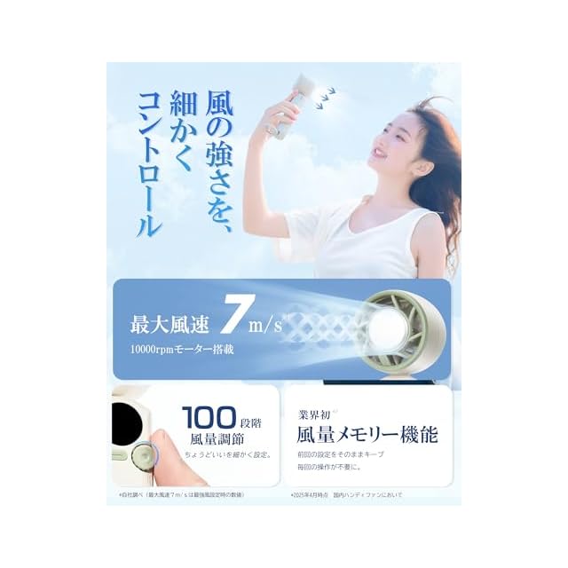 【100段階風量調整&静音設計&メモリー機能】H09ハンディ扇風機は風量はダイヤルをスライドするだけで1〜100段階まで無段階調整可能、やさしい微風から強力な風まで、使用シーンやお好みに合わせて、細かく調整できます。ハンドファンはメモリー機能搭載で、前回の風量設定を自動で再現。毎回の調整の手間がなく、電源を入れるだけで自分好みの快適な風をすぐに体感できます。静音ハンディファンの稼働音は弱モードで約25dB、最強モードで約45db、寝室や図書館、会社など静かな環境でも周囲を気にせず使用できます。