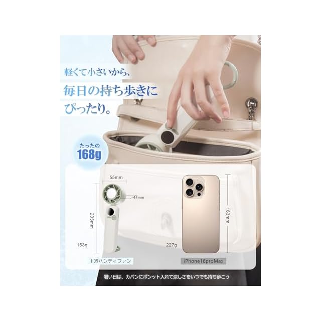 【コンパクトで軽量&滑り止めデザイン&Type-C対応】わずか168gの軽さ、片手でサッと持てる小型携帯扇風機、幅5.4cm・奥行4.4cm・長さ20.5cmとコンパクトなボディは、バッグのなかに入れてもかさばらず、毎日の持ち運びも楽になります。ハンディ扇風機はUSB Type-C充電に対応します(急速充電は非対応)、手持ちファンの背面に滑り止めにデザインされ、汗をかきやすい夏場でも、滑りにくいグリップデザインでしっかりホールド。