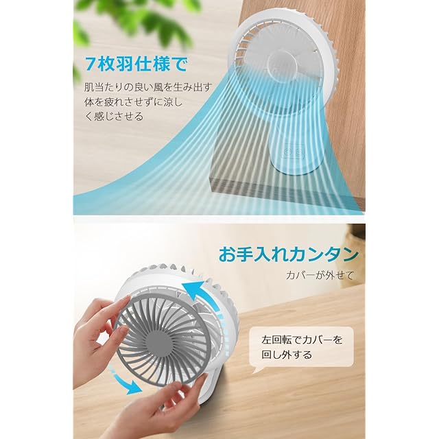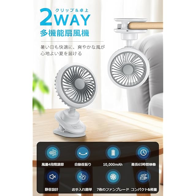 クリップ扇風機 卓上扇風機 充電式 【 7枚羽根ソフト風&3D自動首振り&10000mAh電池内蔵】 USB扇風機 65時間使用可 15db静音 ミニ扇風機 強風 風量4段階調節 携帯扇風機 卓上ファン usbファン 熱さ対策 オフィス/リビング/車用/アウトドア/キャンプ/寝室/トイレ用 (ホワイト)