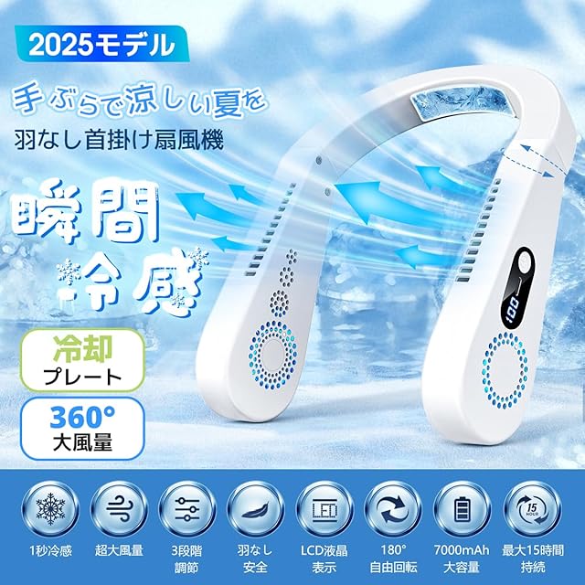 商品名:ネッククーラー 冷却プレート 首掛け扇風機 【ひんやり冷感体験・180°自由回転】 ネックファン 羽根なし 長時間稼働 軽量 首掛け 静音 風量 最強 7000mAh大容量 3段階風力調節 携帯扇風機 ペルチェ素子 ネッククーラー LEDディスプレイ表示 Type-C充電式 熱中症対策 旅行/通勤/通学/アウトドア/夏キャンプ プレゼント 暑さ対策グッズ