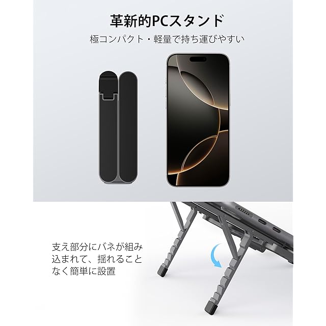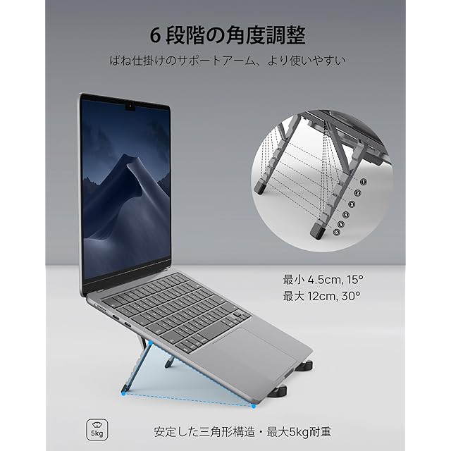 このノートPCスタンドの本体は耐久性と頑丈さに優れたアルミニウム合金で作られています。パソコンと接触する部分は高品質なシリコン素材で覆われており、滑り止め性に優れているだけでなく、パソコンを損傷から守ります。また、シンプルな構造とPCとの接触面積の極度の圧縮により、放熱・冷却効果も非常に優れています。6 段階の高さレベル (45 mm~120mm)と15~30 度の傾斜角度を実現します。人間工学に基づいた設計で、腰痛や猫背のやわらかに役立ちます。折りたたむとわずか127×44×21mmとなり、スマートフォンよりも小さくなります。手のひらに入ってしまう程のコンパクトさ、これならどこへでも持ち歩けます。図書館、カフェ、オフィス、自宅でも快適に使用できます。支え部分はスプリング設計を採用しており、ワンタッチで角度を固定できます。揺れずに角度調整もできるのでとても便利です。安定性も抜群で、強くタイピングしても揺れません。