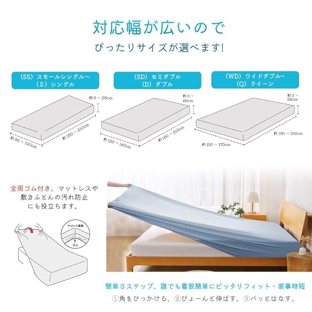 【全面に保護・ズレ防止汚れ防止・収納楽】ボックスシーツの伸縮性よいし、全周ゴム付き、伸シワになりにくく、ズレにくく、シーツが浮くことなく、見た目もすっきり。マットレスや敷きふとんの汚れ防止にも役立ちます。敷き布団にもソファベッドにも引っ掛けたまま折り畳むこともできて収納楽です。