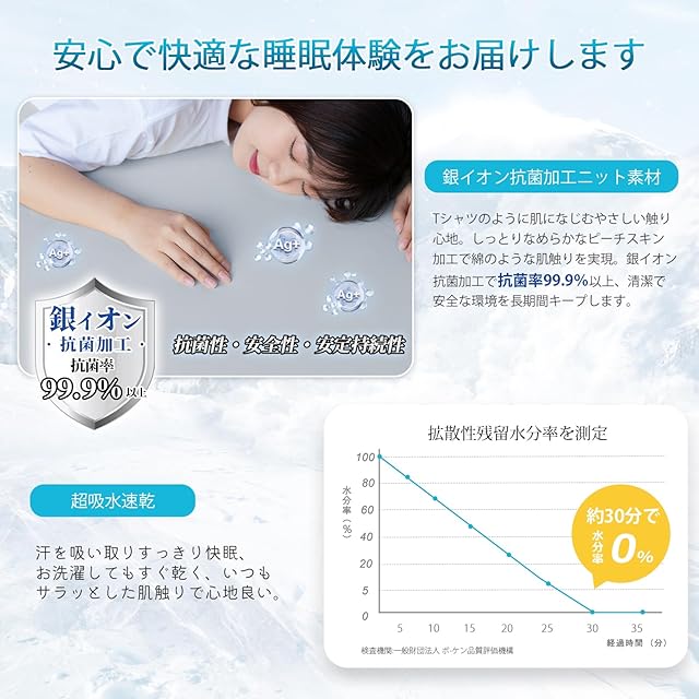 【特殊な技術で、持続的に健康を守り】伸びるボックスシーツの生地は、抗菌防臭加工だけでなく、特殊な加工技術により銀イオンを繊維に融合させ、持続的で安全な抗菌効果を実現します。Ag+は高い抗菌効果を持ち、安全で無毒、肌に優しく、刺激を与えません。極少量の銀イオンでも抗菌効果を持続的で安定に発揮しますので、繰り返し使用や洗濯後でも優れた効果を維持します。二重抗菌保護を実現し、猛暑でもボックスシーツを清潔で衛生的に保ちます。さらに、静電気の発生や花粉の付着を抑えるため、アレルギー体質の方やお子様にも安心してお使いいただけます。