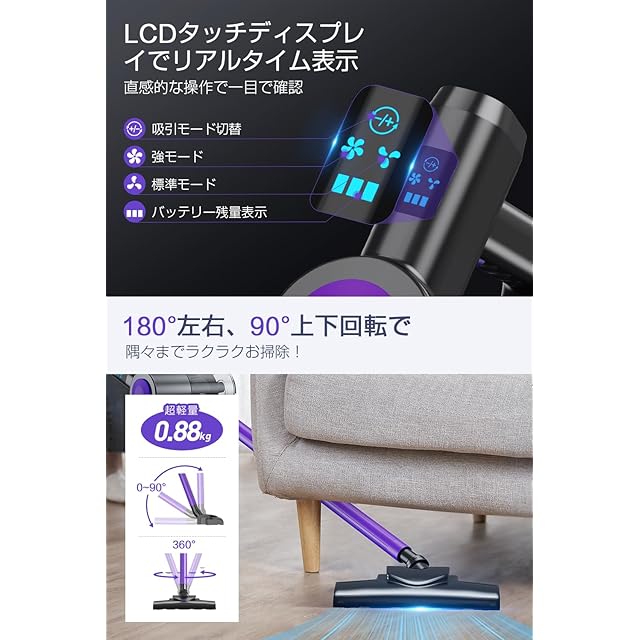 商品名:掃除機 コードレス 【2025革新モデル&26000pa超強力吸引】 サイクロン式 コードレス掃除機 充電式 壁掛け収納&充電 45分連続稼働 ハンディークリーナー スティックークリーナー LCDタッチディスプレイ 左右360°上下90°回転 伸縮型パイプ HEPAフィルター 2段階吸引力切替 軽量 一人暮らし 車用/家庭用