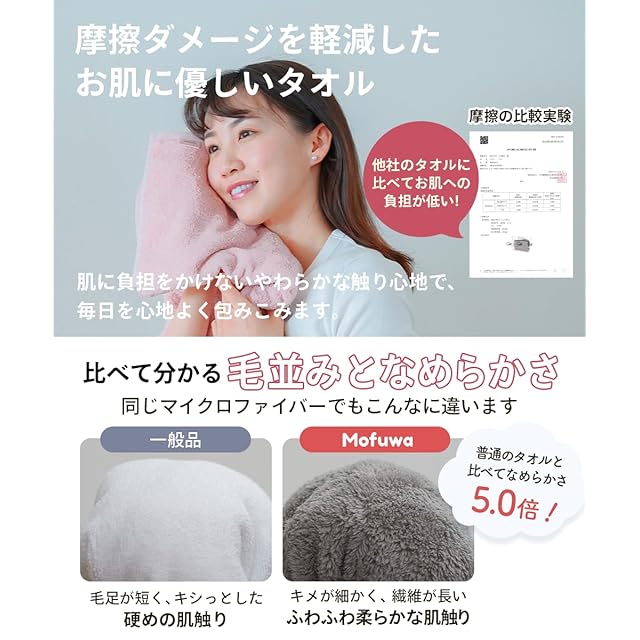 速乾性のあるマイクロファイバー素材 Mofuwaバスタオルは高品質のマイクロファイバー生地を使用しています。速乾性があり、使った後の乾燥も早いので、いつでも快適に使えます。洗濯も簡単です。