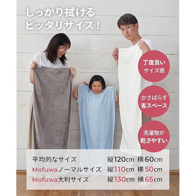 コンパクトサイズで効率的 Mofuwaバスタオルは110cm x 50cmのコンパクトサイズですが、吸水性が高く、体全体をしっかりお拭き頂けます。コンパクトなのでかさばらないのも特徴です。