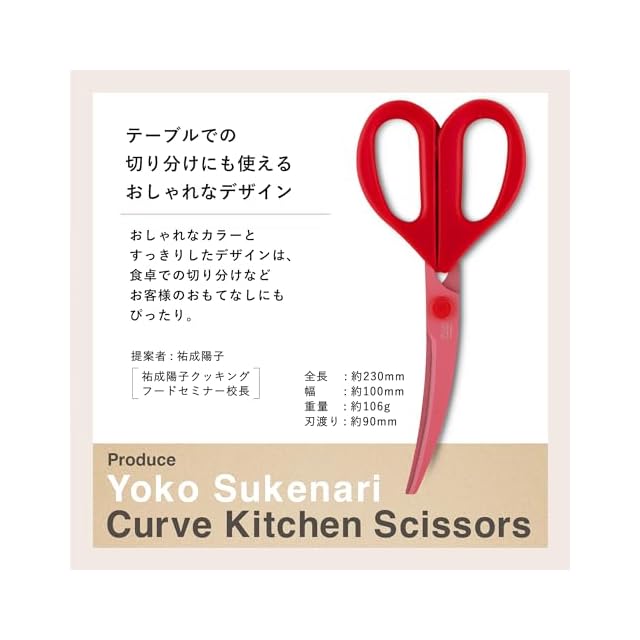 「料理家の逸品 祐成陽子 カーブキッチンバサミ」は、まな板いらずで、下ごしらえや料理の小分け切りにも便利なキッチンバサミです。