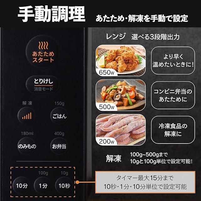 【手動メニュー】食材の種類や機能の選択によって、時間と火力と重量を手動調整でき、手軽に調理を行えます。調理の目安は取扱説明書をご覧ください。また、出力は地域によって異なる場合があります。ご注意してください。