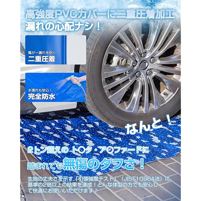 【車にひかれても破れない驚いた強度】引張強度が合格基準の3倍以上の高強度防水素材に、二重圧着加工を施すため、どんな体格が寝転がって、座って、または踏んでいても、ジェルが漏れる心配は全くありません。