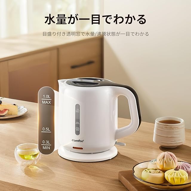 COMFEE' 電気ケトル 1.0L カンタン 急速沸騰 空焚き防止 沸騰自動OFF機能付き お手入れ簡単 コンパクト シンプル 一人暮らしに最適 ホワイト MK-08D03A | Trend Design BASE店