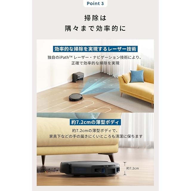 掃除は隅々まで効率的に:約7.2cmの薄型のボディで狭い空間にも入り込み、手の届きにくいところも隈なく清掃します。またiPathレーザーナビゲーション技術により掃除に最適なルートを作成し、効率的に掃除します。