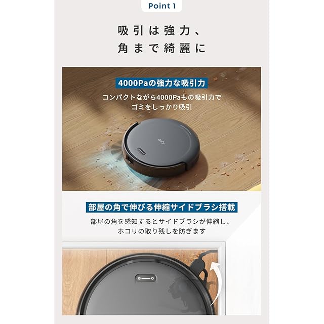 吸引は強力、角まで綺麗に:最大4000Paの強力な吸引力と部屋の角を感知すると伸縮するサイドブラシで、今まで届きにくかった角のゴミやホコリもしっかりかき出し、吸い残しを防ぎます。