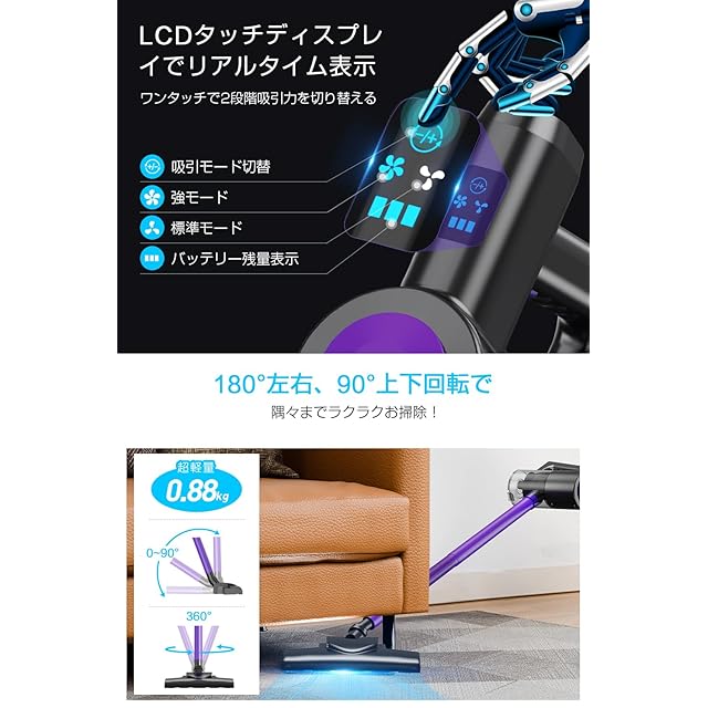 商品名:掃除機 コードレス 【2025革新モデル&26000pa超強力吸引&45分連続稼働】 サイクロン式 コードレス掃除機 壁掛け収納&充電 LCDタッチディスプレイ スティッククリーナー Type-C充電式 2段階切替 自立可能 左右360°上下90°回転 伸縮型パイプ HEPAフィルター 多層濾過 豊富なノズル付き フロア/カーペット/カーテン/ソファ/車に適用 家庭用