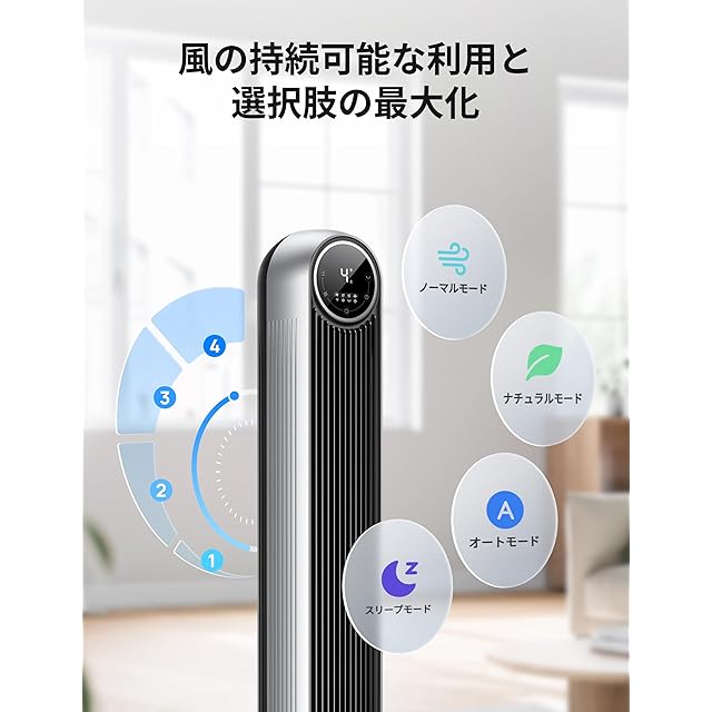 【4つの運転モード・リモコン付き】リビング扇風機の風量が4段階で調整でき、一定風量の送風モード、自然風のような強弱のあるリズム風モード、徐々に風量が下がっていくおやすみモード、室温を検知して風量を自動調整する自動モードの4つの運転モードがあり、シーンに合わせて快適に使えます。見やすいタッチパネルを採用しているほか、リモコンで遠距離操作も可能で、リラックスタイムもゆったり楽しめます。