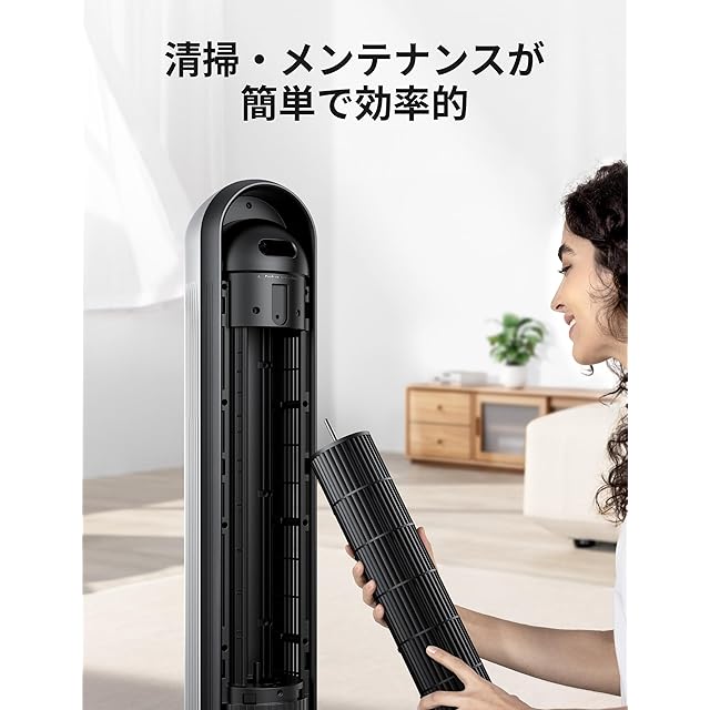 【スリムデザイン・お手入れ簡単】置き場所に困らないスリムなタワー型です。扇風機ヘッドの背面に取っ手付きあり、料理をしているときはキッチン、就寝時はベッドのそばなど、シーンに合わせて楽に移動できます。更に、フィルターは簡単に着脱できるので、汚れが気になった場合は簡単にお手入れできます。