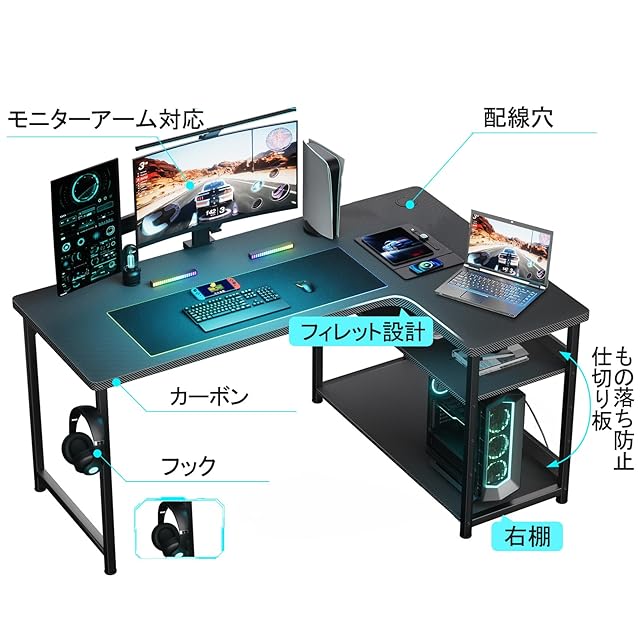 GTRACING ゲーミングデスク パソコンデスク L字 カーボン調 ラック付き モニターアーム対応 棚高さ調節可能 配線穴付き 右棚 50奥行き*110幅*74高さ DL001 Black ジーティーレーシング 机 pcデスク 勉強机 ゲームデスク 棚付きl字デスク オフィス 書斎 ワーク コンセントなし | Trend Design BASE店
