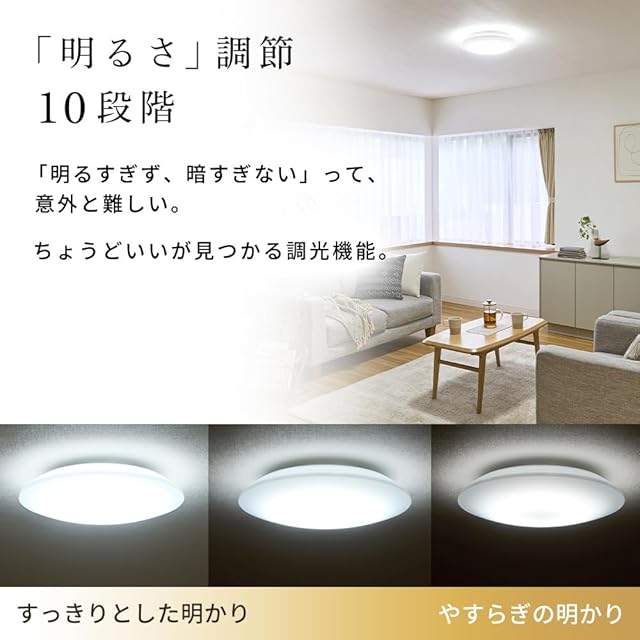 畳数がお部屋の1つ上の畳数を選ぶことで部屋の隅まで明るく照らし、長年快適に過ごせる。さらに、大きい畳数を選ぶことで10年後も明るさが続くので、買い替えの頻度を減らすことが可能になる。