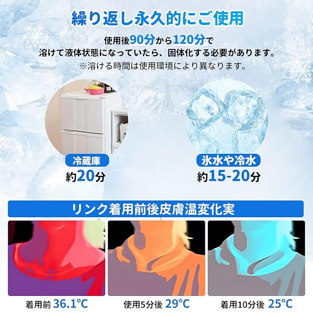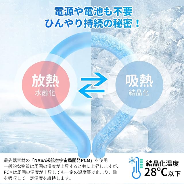 【 アイスネックリング &ひんやり持続の秘密!】この クールネックリングは最先端素材の「PCM素材」を使用、一般的な物質は周囲の湿度が上昇すると共に上昇しますが、PCMは周囲の温度が上昇しても一定の温度警で止まり、熱を吸収して一定温度を維持します。凍結は29°C未満のどこからでも始まります。すばやく体温調節ができ、無理なくクールダウンできます。
