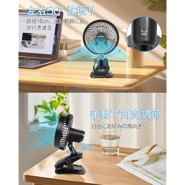 商品名:Keynice USB扇風機 自動首振り 卓上 小型 静音 クリップ リズム 充電式 節電 壁掛け USBファン 風量4段階調節 長時間連続使用 日本語取扱説明書付 KN-618 (ブラック)