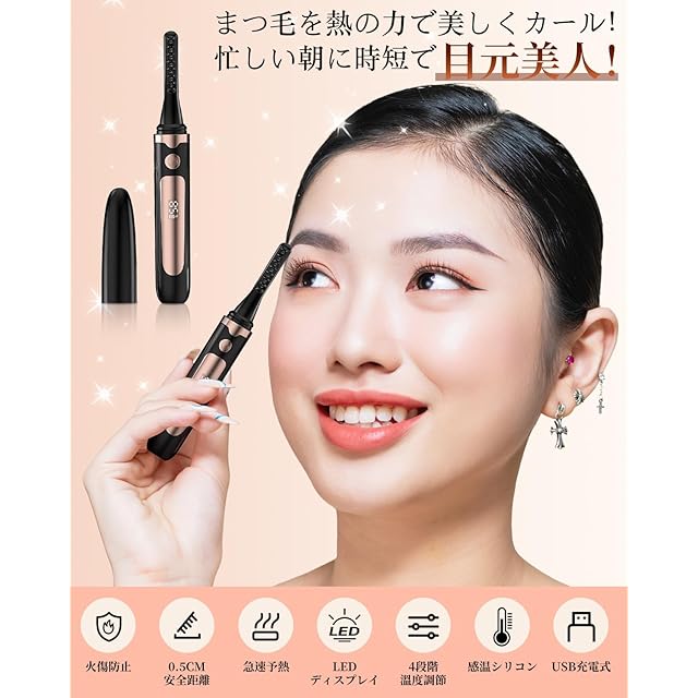 【温熱効果で作る究極の美カール】2024年最新技術を採用し、日本人女性のまぶたのカーブのために開発されてホットビューラー。人間工学設計に基づいた弧型コームで、アイラインに合わせて上下のまつ毛にぴったりフィット、両面コームが付き、360°美しいカール、 ヒータータイプのまつげロールサーフは、ヒーターとまぶたとの距離を延長し、皮膚へのダメージやまぶたへの高温接触を避け、安全・素早く繊細なまつげメイクをサポートします。