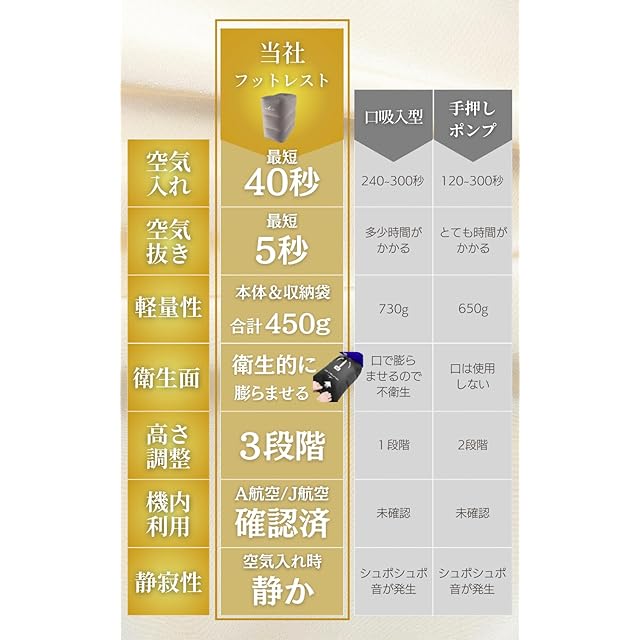 商品名:JON TORUDO フットレスト 【空気入れ40秒で完了】 飛行機 軽量設計 快適グッズ ポンプ不要 足枕 簡単 機内 車 エアークッション 特許庁実用新案申請手続き中