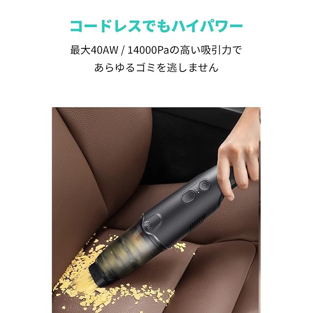 コードレスで強力吸引:最大40AW / 14000Paの強力吸引で、車内のゴミを逃さず掃除。アタッチメントを使用することで、手の届きにくい奥まった箇所や細かな隙間にも対応します。
