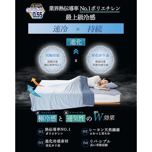 【超高Q-MAX値0.55 究極のW冷感テクノロジーで強冷感実現】新・接触冷感素材を使用したひんやりケットをご紹介します!着用した瞬間から冷たさを感じる最先端レベルの冷感ブランケットです。究極冷感を実現するためには吸湿冷感ナイロンとさらに冷感性が高いポリエチレンを採用し、熱伝導率の高い窒化ホウ素を練り込んだ新開発の糸を使用しました。その独自開発生地の採用により、接触冷感値 (体の熱が生地に移動する量を表し、その数値が高いほど冷たく感じる)は基準値である0.2(触ると若干ひんやりする程度)を約275%上回る最高レベルの0.55で、究極の冷たさを実現しました。熱伝導率No.1の新素材を使い、想像を上回るひんやり感!驚きのスピードで寝返りをうつたび『れいかん』が復活! 吸湿性と通気性に優れたナイロン素材のため、冷感ケットは汗などの水分をしっかり吸収し、こもった水分を拡散させ、速乾してさらっと快適にお使いいただけます。冷感、通気性、肌触りの良さを追求し、夏用で快適な睡眠を得られます。
