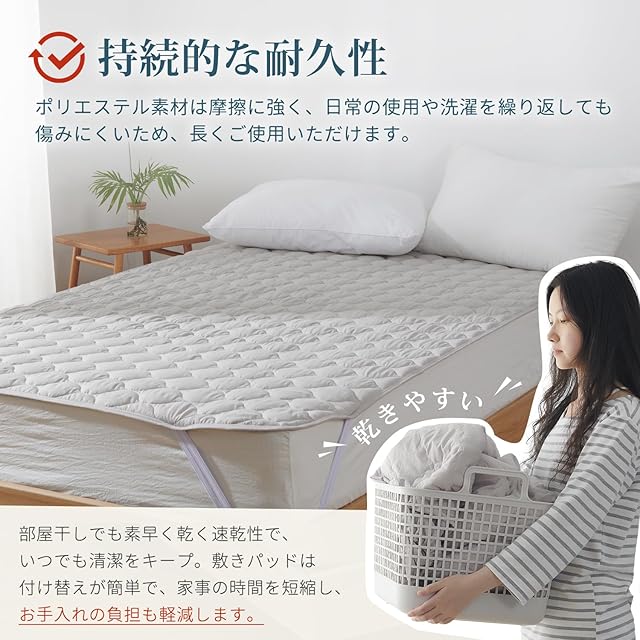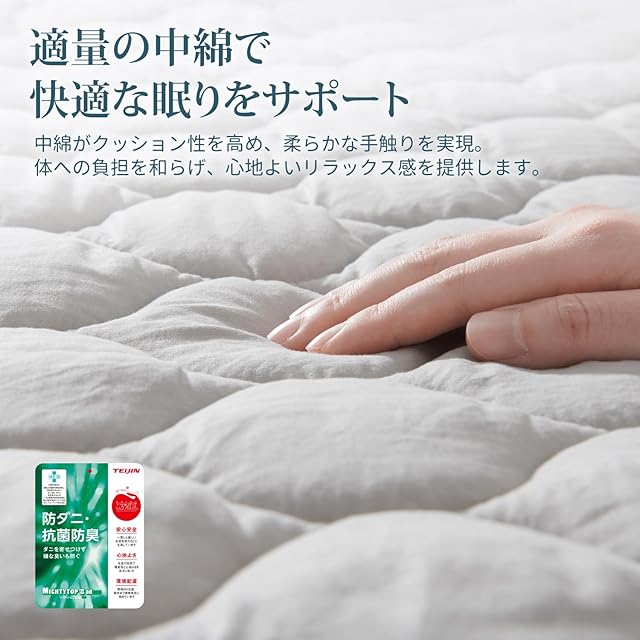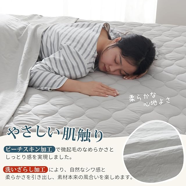 「通気性と速乾性で清潔キープ」高い通気性で湿気を逃し、ムレにくい快適な寝心地を提供します。中綿入りでふんわりとした感触がありながら、速乾性にも優れているため、洗濯後も素早く乾きます。いつでも清潔で快適な睡眠環境を保てます。
