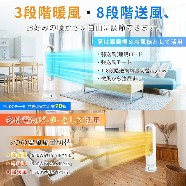 【2025最新冷暖両用 扇風機&省エネ】弊社の扇風機 羽なし 冷風機は、8段階の風量(最大48W)と3段階の温風(弱600W/中900W/強1400W)があり、自由に切り替えることができます。一年中使える 冷風機 です。暑い夏は 涼しい扇風機 として、寒い冬は電気ヒーターとしてお使いいただけます。冷房・暖房兼用ヒーターで、快適な冷房・換気効果が得られ、四季を通じて快適な室内環境を実現します。 さらに、当社のタワーファン 冷風機に使用されている DC モーターファンは、AC モーターに比べて電気代を約 3 分の 1 ~ 4 分の 1 削減できます。扇風機を頻繁に使用したり、エアコンと併用したりする場合は、電気代が大幅に節約できます。